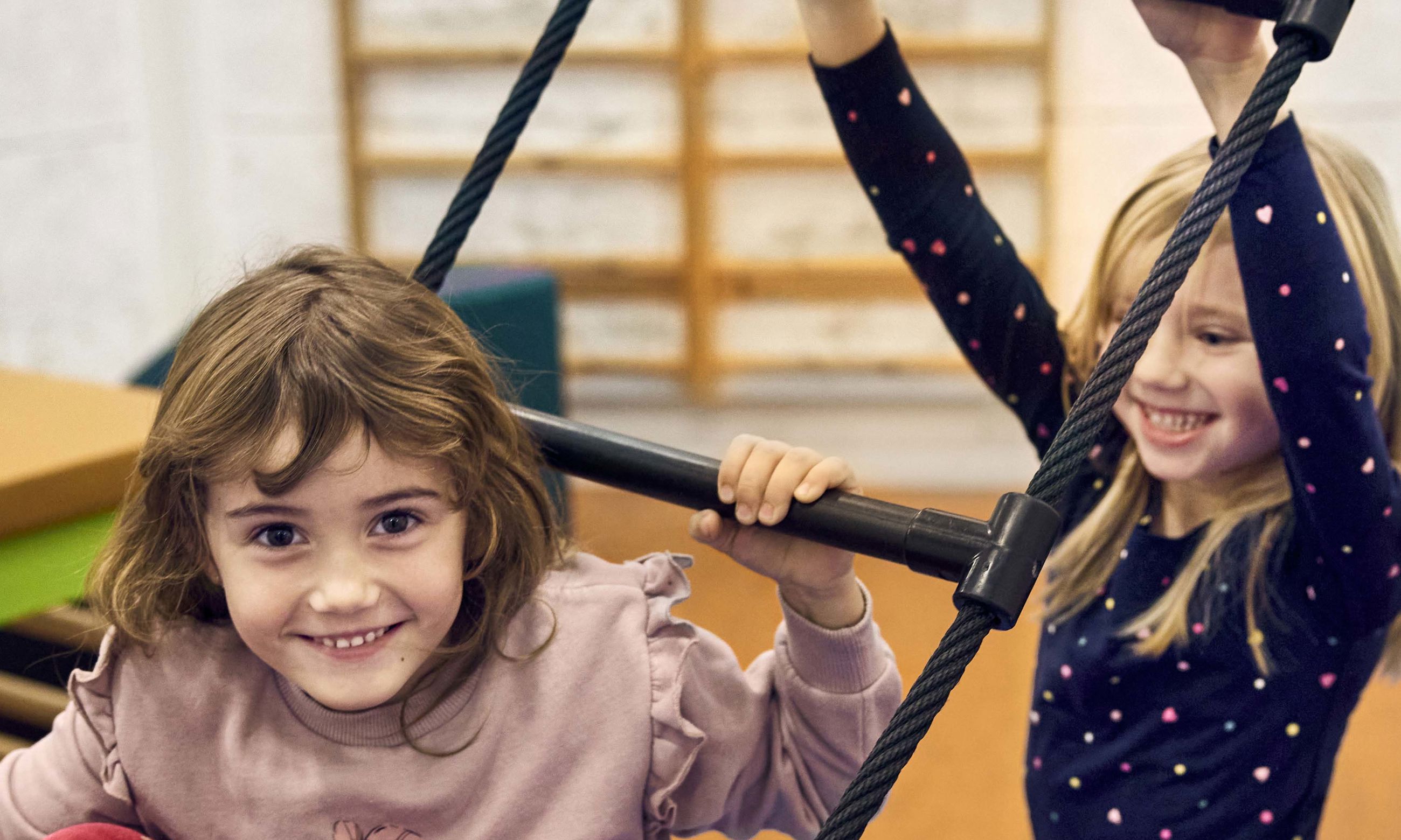 To glade piger leger i gymnastiksal